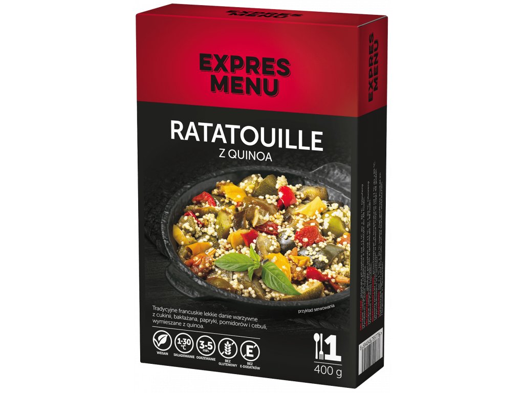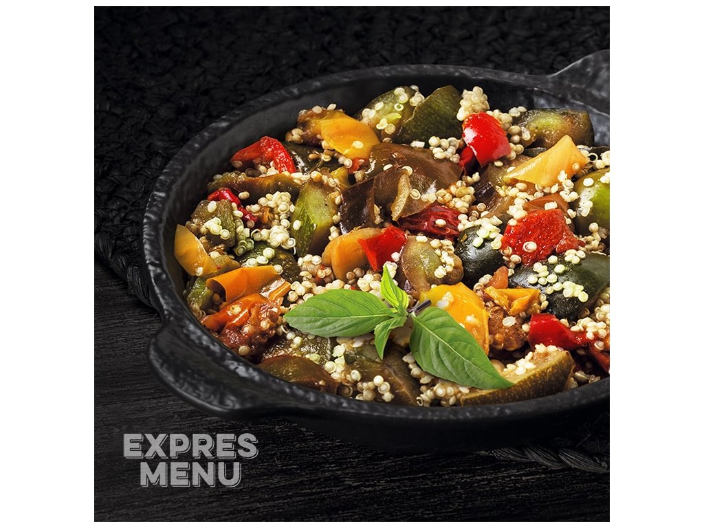 quinoa (17,5 %), papryka, pomidory, bakłażan, cukinia, cebula, sól kamienna, czosnek, przyprawy prowansalskie, pieprz.