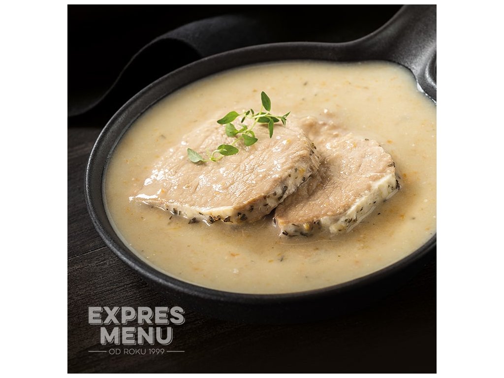 Plaster chudego mięsa wieprzowego w delikatnym sosie śmietanowym.